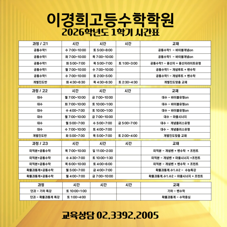 2026학년도 마들, 이경희고등수학학원 1학기 시간표입니다.