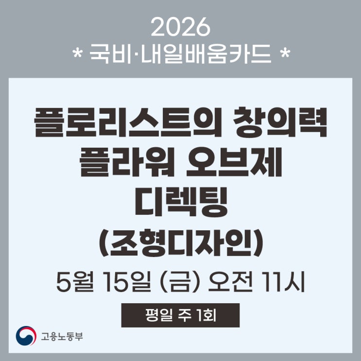 [ 국비 지원 과정 / 내일 배움 카드 ] 안녕하세요! 서울 신촌 지오지오 플로리스트 학원입니다. 2025년 개강 회차가 가장 많았던 인기 훈련 과목 중 하나인 플라워 오브제 디렉팅과정을 추가개강합니다. 많은 학생분들이 디렉팅 과정이 더 길었으면 좋겠다는 의견을 수렴하여 ' 플라워 오브제 디렉팅 ' 과정과 ' 플라워 미디어 아트워크 ' 과정 두 가지로 나눠서 더 심도 있게 배우실 수 있는 커리큘럼으로 구성했습니다. 해당 수업은 내일배움카드를 이용하여 재직자, 구직자, 실업자, 국취제 1유형, 국취제 2유형 모두가 신청 가능한 과정입니다. 내일 배움 카드 발급이 불가하신 분들은 자비부담 100%로 신청이 가능합니....... <img src="https://blogthumb.pstatic.net/MjAyNjAzMTdfMjE5/MDAxNzczNzMyOTQyNzIw.WkqUwsUzEw2Fv-AyKjhnuabRugqHos_J3IKWm9YOA-Ag.sV-e6bfwB4TDhdzDzzLDWkzUKE-kvSToydfkdWn9Ufcg.JPEG/%B5%F0%B7%BA%C6%C3.jpg?type=s3" />
