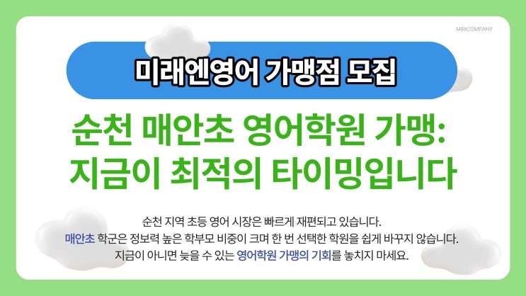 압도적 성장중인 미래엔영어!! 순천 매안초 미래엔영어 가맹 지금이 아니면 늦습니다 순천 매안초 인근에서 영어학원 창업이나 가맹을 고민하고 계신 원장님이라면 지금 이 시점을 절대 가볍게 보셔서는 안 됩니다. 현재 순천 지역 초등 영어 교육 시장은 조용하지만 빠르게 재편되고 있으며 학부모들의 학원 선택 기준 또한 이전과는 전혀 다른 방향으로 움직이고 있기 때문입니다. 특히 순천 매안초 학군은 학부모들의 정보 탐색 속도가 빠르고 기준이 명확한 지역으로 한 번 선택한 학원을 쉽게 바꾸지 않는 특성이 분명하게 나타납니다. 이런 지역에서 영어학원 가맹을 고민하고 있다면 지금이 바로 결정을 내려야 할 가장 중요한 타이밍이라....... <img src="https://blogthumb.pstatic.net/MjAyNjAxMjZfMTA0/MDAxNzY5NDIzMjAwOTc1.JKt2DKWbTHqvA2Cdq3czCWW9C2vUKAl5rUIFSdr9JgIg.zXMSoaGxOa3rlA2Br04wokJLgGcqSyYamAO9sIhXByQg.JPEG/1.jpg?type=s3" />
