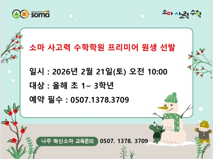 2월에 새학기를 준비하는 프리미어반 선발시험을 진행합니다. 프리미어 과정은 전국적으로 엘리트코스로 여겨져 시험 준비를 열심히 하시는 분들이 많으신데요 프리미어 시험 점수로 현재 수업중인 프리미어 수업에 편입할 수도 있고 새롭게 개설되는 예비초1 프리미어반에 합류하여 수업할 수도 있습니다. 결과가 점수에 못미치더라도 수업의 방향을 설정하고 상담드리니 관심있으신 분들은 시험 예약 부탁드립니다! 비재원생 프리미어 시험은 1년에 1번만 가능합니다. 재원생은 사고력 수업 도중 5, 8, 11월에 추가로 시험 가능합니다. 영재고, 과학고, 성대경시, HMC, KMAO 등의 전국 시험 수상 등 나주 혁신에서 볼 수 없는 실적을 가진 나주....... <img src="https://blogthumb.pstatic.net/MjAyNjAxMjZfMjE4/MDAxNzY5NDA5MTYxMzQ1.VzdwmrD601LQeYZcPmoPbF2ZOKwnTF1BUfl7PhqKyWog.tcpAtV0gA_fHu0cqIOod4PJbSOivbCyZ387zzldz6Sog.JPEG/KakaoTalk_20260126_153145961.jpg?type=s3" />
