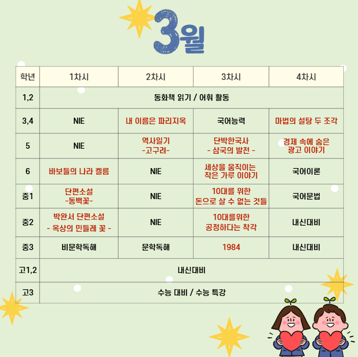 ● 중등부 : 3월 4주차 내신 대비 수업으로 수업 시간 변동이 있을 수 있습니다. ● 고등부 : 3월부터 내신 대비 수업 진행합니다. <img src="https://blogthumb.pstatic.net/MjAyNjAyMjdfMjEz/MDAxNzcyMTg5NjkwMjYx.r3eeH3BJinoOn6OclYuSFTw8myqZ-rvfvf0KtoYbqXkg.hP7QEgw_EzYpjUp9pZIJvFKCE0-Rcd1o7EiefWtAQKgg.PNG/1772189674827.png?type=s3" />