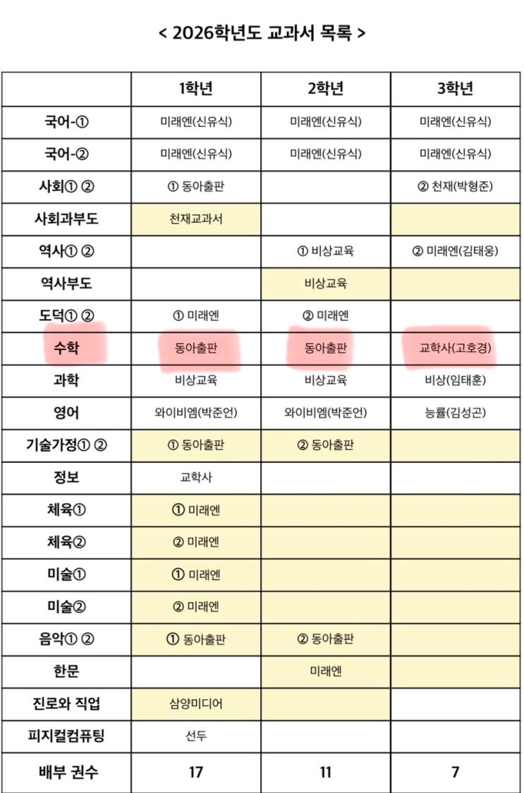 3월, 새 학년을 앞두고 많은 중학생 자녀를 둔 학부모님들께서 이런 부분을 가장 걱정하십니다. “우리 아이가 이번 학기 수업을 잘 따라갈 수 있을지” “교과서가 바뀌었다는데 미리 준비해야 하는 건 없는지” 특히 중학교 수학은 초등학교 때와 달리 교과서 출판사와 단원 구성에 따라 문제 유형과 난이도가 달라지기 때문에 입학 전, 신학기 전에 준비 방향을 제대로 잡는 것이 무엇보다 중요합니다. 오늘은 2026년 마산 해운중학교 교과서별 출판사 목록과함께 학년별 수학 준비 전략을 알려드리겠습니다 <출처- 마산 해운중학교 홈페이지> ✔️마산 해운중학교 1학년 수학 - 동아출판 ✔️마산 해운중학교 2학년 수학 - 동아출....... <img src="https://blogthumb.pstatic.net/MjAyNjAyMjRfMTEg/MDAxNzcxODU5OTg1Njc2.SmfNcwf6nb6kGW_e-RiGzgotZjKIiQF_dmmerwxVxXgg.HEH9Zxh8BBxFGmerN1OCDxijbvds_ZN7fsIuZQcyTcgg.JPEG/IMG%A3%DF0841.jpg?type=s3" />
