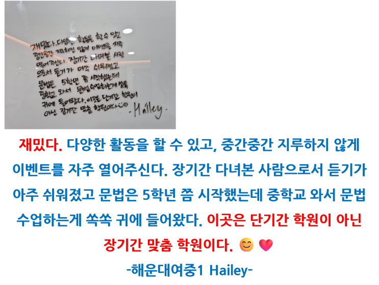 제가 바라는게 많은지 어찌 알았는지....예리한 제이스입니다. 지난 3월 14일 토요일, 제이트영어학원 미니 설명회를 진행했습니다. 토요일이 점점 다가오는데, 문득 제이트 아이들은 제이트를 어떻게 생각하면서 다니고 있는지 문득 궁금하더라고요. 그러고는 수요일 저녁에 학원 입구에 화이트보드를 내놨습니다. 목요일에 등원하지 않는 아이들도 있어서 모든 아이들이 쓰지는 못했어요. 그래도 이렇게 깨끗했던 화이트보드가 한명 두명 쓰기 시작하더니 목요일 오후 즈음에는 가득메워 졌더라고요. 한번도 아이들에게는 내색하지 않았던 저의 교육철학이 슬며시 아이들에게 스며들었구나 하는 생각도 들었고, 아이들이 긍정적인 후기를 써줘....... <img src="https://blogthumb.pstatic.net/MjAyNjAzMTlfMTky/MDAxNzczODcwNzY4NjU2.z7a6fAr0T9_CDyLD0BgJBfZMJnvC-eQ1HBbaM20PfBEg.xVOIXqYbM1aQuDvVkMdI2KsIKWIuf8dUdHfojcuwhhsg.PNG/%C7%EC%C0%CF%B8%AE%C8%C4%B1%E21.png?type=s3" />