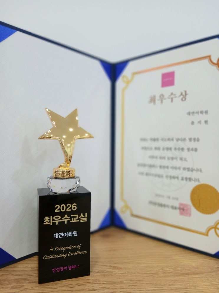 [대연동 영어학원 , 대연동 영어] [대연초영어학원, 연포초영어학원] "초중등 영어전문학원" [1호점] 삼성영어 대연어학원 [2호점] 삼성영어 대연연포어학원 대표원장 꼼꼼 깐깐 데미 입니다 오늘은 삼성영어대연어학원 수상 소식과 초등 졸업 소식을 알려 드리려고 해요 5년 연속 최우수학원 수상 삼성영어 대연어학원이 2026년도 최우수학원으로 선정되었어요! 축하해 주세요^^ 2020년 오픈 이후로 5년 연속 최우수 학원으로 상을 받았답니다 이번엔 현판이 아닌 트로피로 받았어요 정말 멋지네요! 상장과 트로피 그리고 포상품으로 티박스 어학기까지 받았어요~ 최우수교실 시상식은 2026년 삼성영어 영남본부 세미나에서 시상 하였....... <img src="https://blogthumb.pstatic.net/MjAyNjAyMTdfMjcz/MDAxNzcxMzAwNjk3MTY5.RL1C_ItAgB18-dHCJybjAB8JxlV2Og4Vst4kV-ZEGc0g.HltTUubXxNjeNI7Ru6m16MNpcVkllr56TageD-osf9Eg.JPEG/KakaoTalk_20260217_123921550_07.jpg?type=s3" />