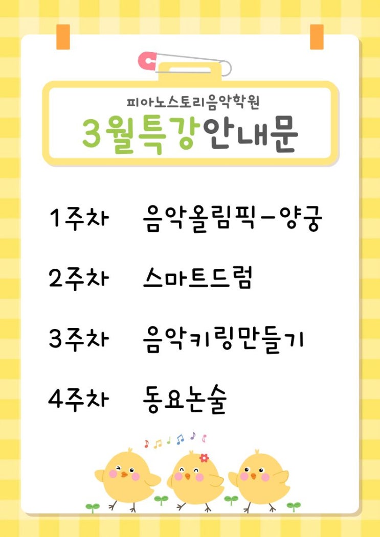 안녕하세요 피아노스토리음악학원입니다. 벌써 새학기의 3월입니다. 우리 학원에서는 매달 다양한 특강 프로그램을 체계적으로 진행하고 있습니다. 체계적인 수업은 꾸준한 고민과 계획에서 나온다고 생각합니다. 칠곡에 위치한 피아노스토리 음악학원에서는 매달 특강을 계획하고 아이들이 즐겁게 배우며 음악을 익힐 수 있는 수업을 진행하고 있습니다. 이번3월도 체계적인 특강을 위하여 프로그램을 만들어 보았습니다. 3월 특강 프로그램을 소개할게요. 위치 & 상담 예약 링크 채팅 문의 링크 수업 문의: 010 7753 5771 #칠곡피아노학원 #학정동피아노학원 #칠곡음악학원 #학정동음악학원 #유아음악교육 #유아피아노....... <img src="https://blogthumb.pstatic.net/MjAyNjAzMDZfNDYg/MDAxNzcyNzkyNTg0NTM3.fneIhc200YEfEHREYp4ytAd_YZ2fZK76K_8FsujcKlcg.kPLr6CR-dzrJrmjZxWnAUO_JOysikC9aSuFElSnoZsMg.JPEG/1772510795160.jpg?type=s3" />