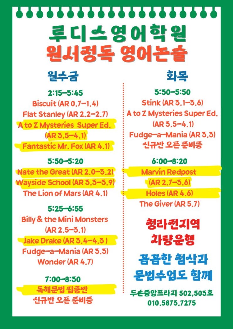 설날이 끝나고 정신차려보니 3월이 성큼!! 다가왔네요. 멀리 청심국제중으로 진학하는 친구에게 인사 멀진 않지만 이제 자주 보지 못할 인천국제고에 입학하는 언니에게도 인사 더 멋진 미래를 향해 떠나는 루디스 친구들의 뒷모습을 보며 묘한 뿌듯함과 아쉬움이 함께합니다. 그와 동시에 새롭게 만나고 있는 루디스 친구들에게 또 한 번 반하고 있는 요즘, 청라의 대표적인 원서정독 영어논술 루디스영어학원에서 3월 수업안내 드립니다. 독서수업 특성상 정확히 월말 월초에 책이 시작되지는 않지만 유난히 새로운 책들이 많이 들어가는 시기입니다. 노란색으로 하이라이트 된 책들은 새로 들어갔거나 시작되는 반들이에요! 대부분....... <img src="https://blogthumb.pstatic.net/MjAyNjAyMjRfMTkz/MDAxNzcxODkxNjg2OTg5.ODP1jc9_orRdYydxlRxO3jtGv22LfUVO52NXgzUW9v4g.me-j4ku1oRCXYtQ4i5gN7ERn-loY-1uaGahII--UxgUg.JPEG/26%B3%E2_3%BF%F9_%BC%F6%BE%F7%BE%C8%B3%BB.jpg?type=s3" />