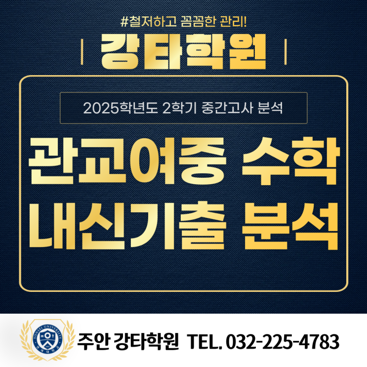안녕하십니까!주안 수학학원 강타학원 입니다. 오늘은 관교여중 3학년 2학기 중간고사 수학 기출문제를 분석해 보도록 하겠습니다. 이번 시험은 전반적인 난이도는 무난한 시험이었으나 문항수가 많아 실수를 줄이는 것이 중요한 시험이었습니다. 교과서와의 연관성이 높기 때문에 교과서 문제의 암기와 실전 감각을 유지 시키는 모의고사 연습방법을 숙달 해야 합니다. 수많은 학생들에게 수학을 가르치며 느낀 사실이 있습니다. 그건 바로, 중학교 내신 시험에서 수학 점수를 잘 받던 학생들 대다수가 고등학교에 올라가서 귀신같이 수학 점수가 하락하는 경험을 한다는 겁니다. 이런 일이 발생하는 이유는 아주 명확합니다.고등학교 내신 시험....... <img src="https://blogthumb.pstatic.net/MjAyNTExMTdfMTQ3/MDAxNzYzMzY0MzI1ODI5.y5_Ale3VrSBSX1okDjj9tgY8_uYFYX9YI-XCXD6pGdgg.U6uUm6YiB-ptkKRTQ5sqfEO7UOxPsR3qRuxktKcCp0sg.PNG/%B9%CC%B7%A1%BF%A3%C3%CA%B5%EE_%BA%B9%BB%E7%BA%BB-001_%283%29.png?type=s3" />