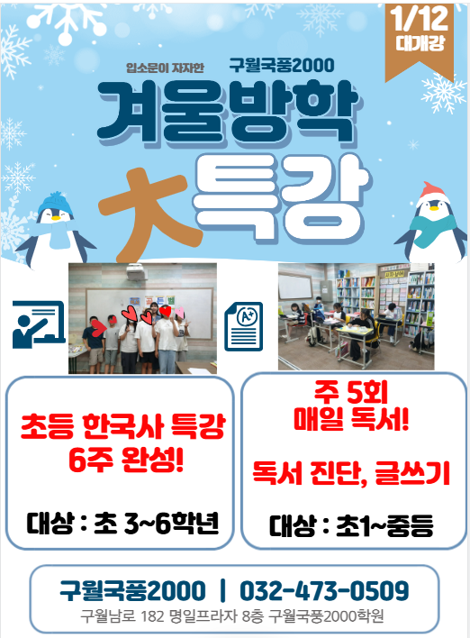 구월동 독서논술 구월동 한국사 구월국풍2000 초등 겨울 방학 특강 방학이 다가오면 늘 고민되는 것이 있습니다. “우리 아이, 이번 방학을 어떻게 보내야 할까?” 학부모님들 마음 충분히 이해합니다. 그래서 구월국풍2000에서는 아이의 성장에 가장 도움이 되는 두 가지 핵심 습관 바로 독서력과 한국사를 집중적으로 키울 수 있는 방학 특강을 준비했습니다. 이번 방학만큼은 걱정보다 ‘성장’을 더 많이 느끼실 수 있도록, 편안하면서도 깊이 있게 안내드릴게요. 매일독서 특강 주 5회, 월화수목금! ‘꾸준함’이 아이의 독서력을 완전히 바꿉니다. 부모님들도 잘 아시죠? 독서만큼 아이의 전 과목 실력을 키워주는 습관이 또 없습니다. 그....... <img src="https://blogthumb.pstatic.net/MjAyNTEyMDRfMjIy/MDAxNzY0ODI3OTk5MjU3.1EYYrOvwp1IZG4TarrxKvy23IQy8XEppWHwenxF7FSYg.3y2zaEiKm08y3tIY7LVtz9lVHD2MjwavdGZIF0U3Wmcg.PNG/%BD%BA%C5%A9%B8%B0%BC%A6_2025-12-04_145945.png?type=s3" />