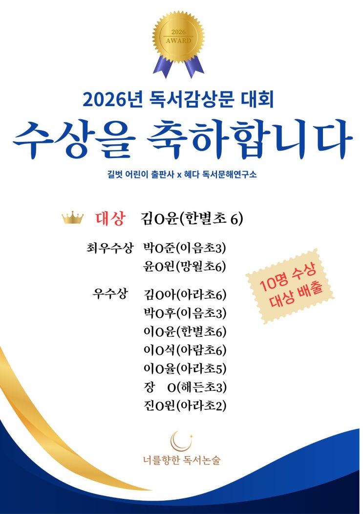 안녕하세요. 이번에 정말 기쁜 소식이 있습니다. 길벗어린이출판사에서 주관하는 전국 독후감상문 대회에서 저희 원 아이들 중 대상 1명을 포함해 총 10명이 수상하는 성과를 얻었습니다. 특히 대상 수상은 한 아이의 결과이기도 하지만, 그 과정 속에서 쌓아온 시간과 노력의 결실이라고 생각합니다. 하지만 이번 결과에서 더 의미 있었던 것은 ‘수상’ 그 자체보다 아이들이 그 과정에서 보여준 변화였습니다. 한 문장을 쓰고 지우기를 반복하며 끝까지 글을 완성해내는 힘, 자신의 생각을 글로 표현하고 세상과 연결해보는 경험, 그리고 다시 도전하려는 태도까지. 아이들은 이번 경험을 통해 성취감과 자신감, 그리고 도전 정신을 배웠....... <img src="https://blogthumb.pstatic.net/MjAyNjAzMjBfMTM1/MDAxNzczOTk5MzU0NDA3.510QhE4J5q5DHj2cAC4w6AONp38t5T_Wd04C2m-YBOcg.0mhviR6g6EFV_YpVapiAZHhQeI1s4DQFoalAgqBgtGUg.JPEG/%B4%EB%C8%B8_%BC%F6%BB%F3.jpg?type=s3" />