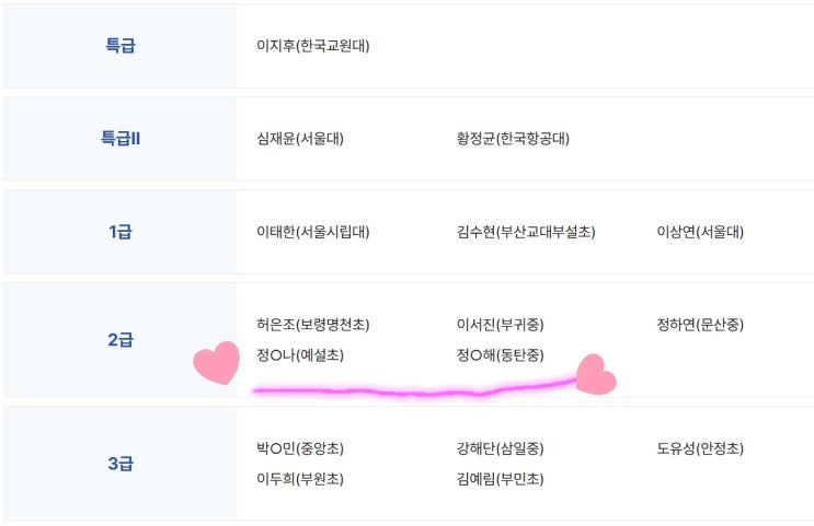 저희 율곡한자에서 공인급수 2급에 합격한 세 친구들 이야기를 올렸었는데요. 세 명 중 두 친구가 동점이었거든요 2급 150문항 중 135개를 맞아서요 그런데 그 두친구가 어문회에서 수여하는 난정장학금 수상자가 되었습니다ㅠㅠ 50만원 !!!! 1급은 60만원 2급은 50만원 3급은 40만원 . . 이렇게 차등지급 되구요. 장학금은 5급부터 특급까지 수여합니다. 매 회차마다 수여하는 건 아니구요. 2~3회차 합쳐서 선발을 거쳐 수여하는데 자랑스럽게도ㅠㅠ 우리 율곡한자 친구들이 장학금을.ㅠㅠ 1인당 50만원 ㅠㅜ 급수시험 중에 가장 어려운 어문회에서... 공인급수 합격도 칭찬할만한데,, 장학금까지.. 쉽게 말해 전국 1등 .. 으아아아~~~~ 1급이나....... <img src="https://blogthumb.pstatic.net/MjAyNjAyMTZfMjIx/MDAxNzcxMjI0MzE4MTgy._2_6LL1WK5YCjNmWC8K0UZdUvoha8N_dzBu0v3bRI-cg.1gYnb9ObyaMG8h7Dv3weXwmil9bcpEYN2H1eS1gv4ZUg.JPEG/KakaoTalk_20260216_153043045.jpg?type=s3" />
