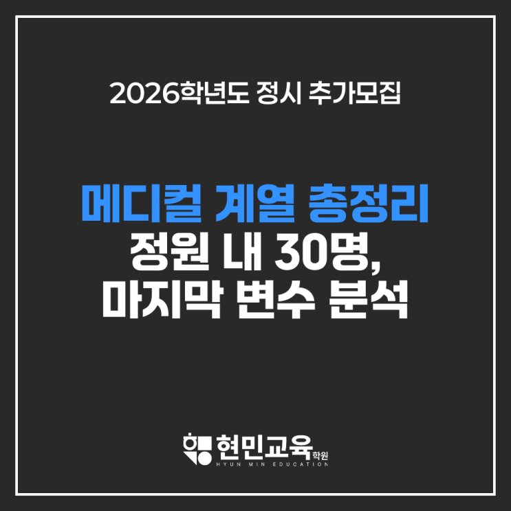 교육에 진심을 담다. 동탄에 위치한 현민교육학원 수학관입니다. 2026학년도 대학 입시는 정시 합격자 등록을 끝으로 마무리되는 듯 보이지만, 실제로는 정시 추가모집이라는 마지막 변수가 남아 있습니다. 추가모집은 정시 최초 합격자와 예비합격자 등록 이후에도 발생한 결원을 선발하는 절차로, 모집 인원은 적지만 입시 결과를 뒤바꿀 수 있는 유일한 구간입니다. 특히 최상위권 수험생들이 목표로 삼는 의대·치대·한의대·약대·수의대(의치한약수) 계열에서 정원 내 기준 총 30명의 추가모집 인원이 확인되었습니다(2026년 2월 13일 기준). 이는 단순한 숫자 이상으로, 수험생 이동이 실제로 발생했다는 의미를 담고 있습니다. 1. 2026학년....... <img src="https://blogthumb.pstatic.net/MjAyNjAyMjVfMTE2/MDAxNzcxOTU1NDEzOTE4.vNffmzURpaC38eiRGmzhI0yx0rEhr-XKqZW6Iyvpbwog.ymmIM1xJfIxzob5cDehXM2_N5s9OJjG5SvHfxFJ3uNwg.PNG/%BD%E6%B3%D7%C0%CF20.png?type=s3" />