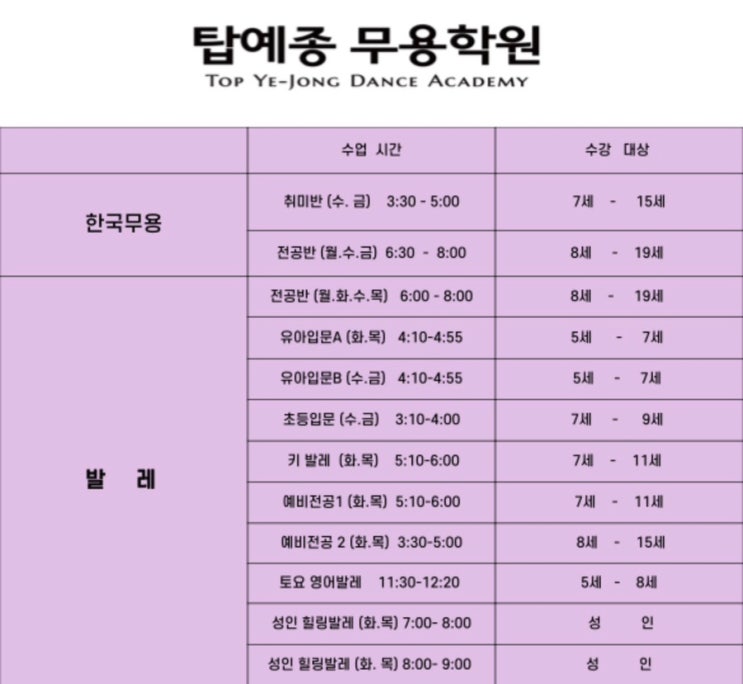 무용학원 시간표 판교 분당 성남 이매동 야탑
