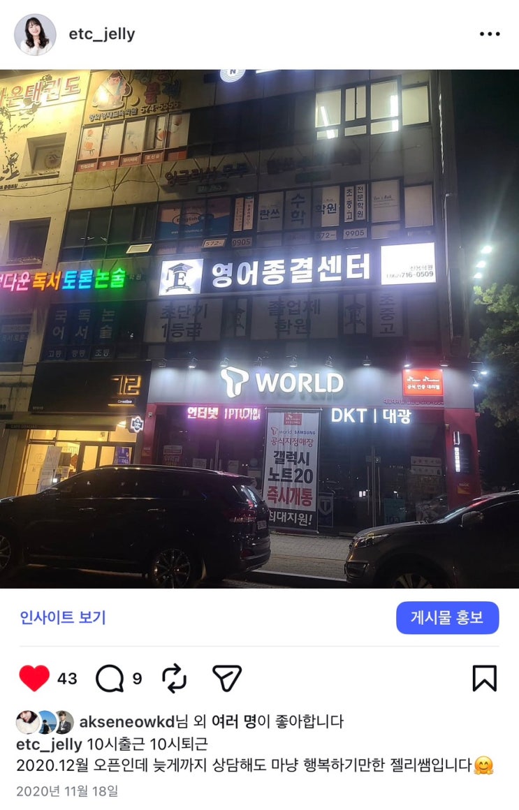 배움을 디자인하고, 성장하는 과정을 기록하는 공간 2020년 첨단2지구 영어종결센터를 시작으로 2022년 영어종결센터 초등관 오픈 2024년 아이들을 위한 젤리북스 오픈 2026년 영어도서관 리딩라운지 오픈 예정, 학생들의 일정, 과제 관리를 도와줄 어플 개발중, 동시에 학원과 학생, 학부모님의 소통을 원활하게 도와줄 관리 프로그램을 개발하고 있어요. 이 블로그에 학원 뿐만 아니라 젤리쌤의 성장 과정의 기록을 담아보려고 합니다. 교육&브랜드 영어종결센터 입시관 : 초6~ 고3까지 입시 영어, 내신과 수능 문제를 잘 풀게 하는 공부를 합니다. 1등급 나오면 학원을 졸업하는 시스템 영어종결센터 초등관 : 영어의 시....... <img src="https://blogthumb.pstatic.net/MjAyNjAyMTNfMjUg/MDAxNzcwOTQ5OTU2MjY2.Vvv3k9TBg0j6OsLrx-pg42JS5NM0twXWPczLVAheErog.0BV_oeELjbs8CgIe-ipiVpM93AmxqRHF8QeNenztMWkg.JPEG/IMG%A3%DF1751.jpg?type=s3" />