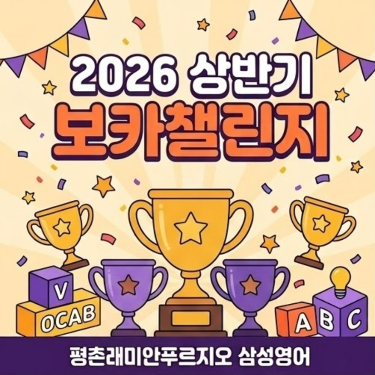 2026 상반기 보카챌린지 우리 아이 영단어 장기 기억 프로젝트! 안녕하세요! 안양비산동 안양중앙초, 샘모루초 학생들의 든든한 영어 길잡이, 평촌래미안푸르지오 삼성영어입니다. 평소 저희 원에서는 개인별 맞춤 수업과 함께 매일 개별 단어 테스트를 시행하고 있습니다. 하지만 일 년에 두 번, 다 함께 '으쌰으쌰' 단어 학습에 깊게 몰입해 보는 특별한 기회가 있습니다. 올해도 어김없이 우리 아이들의 어휘력을 한 단계 끌어올려 줄 '2026 상반기 보카챌린지'가 찾아왔습니다! 왜 '보카챌린지'를 해야 할까요? (단어 시험의 5가지 핵심 효과) 단순히 단어장을 눈으로 읽고 쓰는 것을 넘어, 클래스....... <img src="https://blogthumb.pstatic.net/MjAyNjAzMDdfMTI0/MDAxNzcyODY4MDM2ODgz.iYKmbeRr9C1e8EXMEGtg0QPtS-t-9LIQ6ThYoOUo8ysg.kV4284CREMhiPGKSAqnL4ds3Bu6b6GmdB23cKBunQ1sg.PNG/1.png?type=s3" />