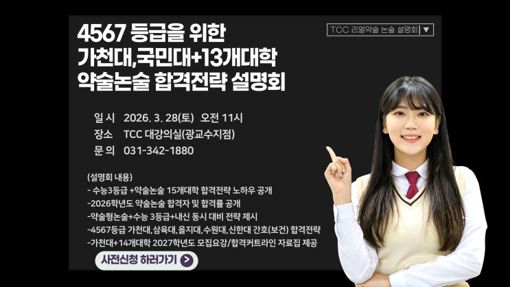 내신성적이 456등급인 학생들은 대부분은 인서울대학을 합격하기위해 수능준비에 올인하는 경우가 많이 있습니다만 재수생이 압도적으로 유리한 수능시험에서 3등급을 찍고 인서울대학 합격하기는 현실적으로 매우 어렵답니다 4567등급 학생 대상으로 인서울대학 합격을 전문으로 하는 TCC 약술논술전문학원 설명회에 참석해서 가천대,국민대,한국외대(자연),상명대,서경대 인서울 대학 합격전략과 가천대,을지대,삼육대,수원대,신한대 5개대학 간호(보건)학과 합격을 위한 노하우를 확인해보세요 <img src="https://blogthumb.pstatic.net/MjAyNjAzMDlfMTYy/MDAxNzczMDM2MDE4NjUx.QW5TN0WuYGPk5uSEIBaOOWRANoPQx6-bVR3I8UqQwuAg.UidpU6MhBVkG3Py_SZDJxMFpTQAWf6h8m6XMXBHkKscg.JPEG/3%BF%F9_28%C0%CF_%BC%B3%B8%ED%C8%B83%28%B1%A4%BC%F6%C1%A1%29.jpg?type=s3" />