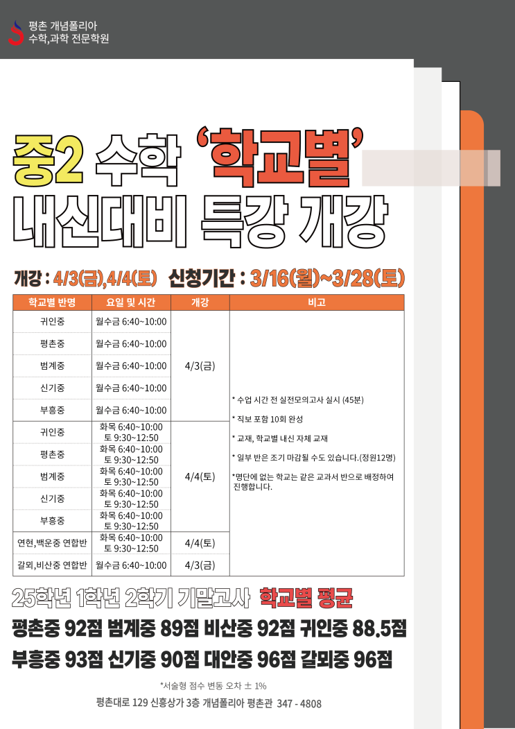 [평촌개념폴리아] ★중2-1 수학 학교별 중간고사 대비 특강★