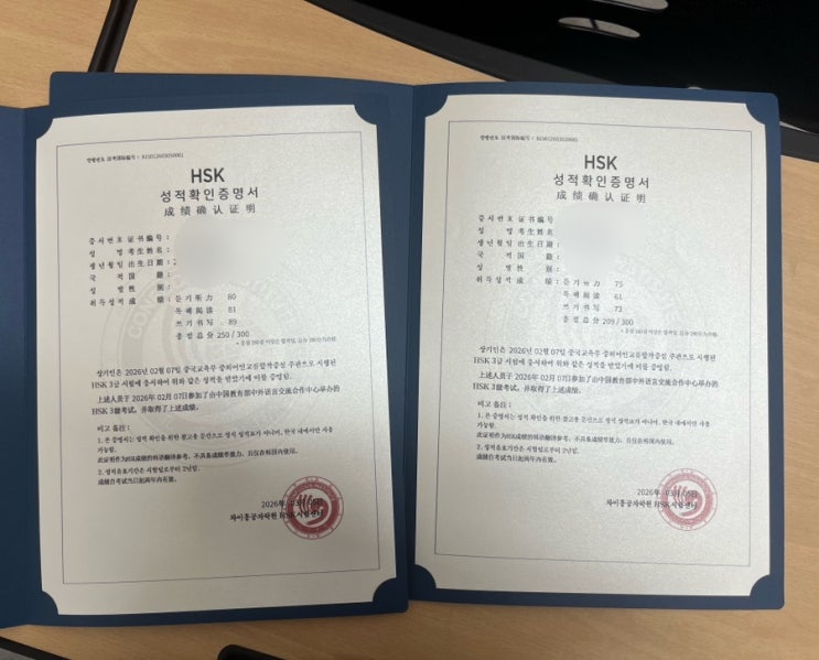 이번 방학 동안 두명의 찐통쉬에는 HSK3급 2월 시험을 목표를 세우고 열심히 준비해서 좋은 성적으로 합격 했습니다☺️ 단어와 기본 문형을 차근차근 익히고, 듣기, 독해와 쓰기 각 영역의 문제를 반복 연습하며 실력을 쌓아 갔습니다. 방학 동안 성실하게 노력한 결과라 더욱 의미 있는 성과입니다. 방학 동안 열심히 노력해 준 두 학생이 정말 대견하고 자랑스럽습니다. 앞으로도 계속 성장해 나가길 응원합니다. 다시 한 번 합격을 진심으로 축하합니다! <img src="https://blogthumb.pstatic.net/MjAyNjAzMTNfNjgg/MDAxNzczMzY1MzM1NzI3.D_ib-Nj0MMOr2AW5lziRZPHirESqJKoinq72ccC8tKEg.dndx9zWesS-NxVmoZ0YKGVfEdYFiYCy4lVSGM9Mm4p8g.JPEG/IMG%A3%DF2425.JPG?type=s3" />