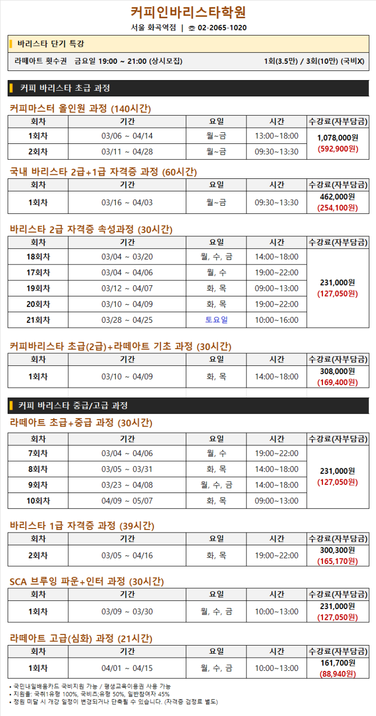 [26년 3월 개강] 화곡 커피학원ㅣ 바리스타 과정 시간표