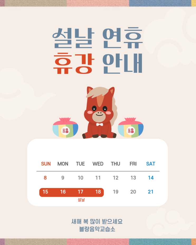 설 명절이 다가왔습니다. 가족들과 따뜻하고 행복한 시간 보내시길 바랍니다 설 연휴 휴강 안내 2월 16일(월) ~ 2월 18일(수) 법정공휴일로 휴강입니다. 연휴 이후 밝은 모습으로 만나겠습니다 새해 복 많이 받으세요. •••••••••••••••••••••••••••••• Blanc Music Academy 유치부부터 성인까지, 각자의 속도에 맞춰 스스로 연주하는 힘을 키웁니다. 시간정원제(시간당 4명) 유치부·예비초 전용 교재/교구 월간 평가서 + 개별 피드백 작품반(레퍼토리/테크닉) · 수행평가 대비 피아노 전공 원장 직강 / 레슨 경력 10년 이상 옥계 삼구트리니엔 상가동 2층 <img src="https://blogthumb.pstatic.net/MjAyNjAyMTNfMTc5/MDAxNzcwOTg2MDgyMDM4.wpm1Wju_C5wlyGMQeJr9hp48I_Y0ze9d12eBCEO5140g.PGzhvn11jYUzdDsFwyXh_uMCUAA-wr4F-zkkJjieciUg.PNG/%C1%A6%B8%F1%C0%BB_%C0%D4%B7%C2%C7%D8%C1%D6%BC%BC%BF%E4..png?type=s3" />
