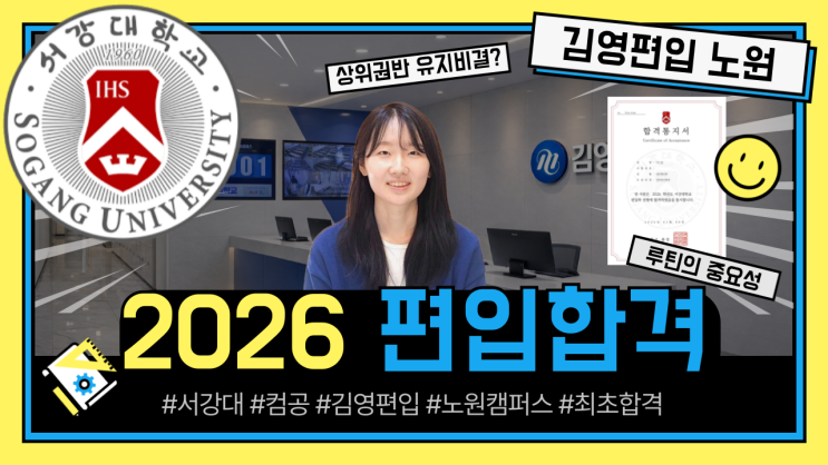 안녕하세요. 강북권 편입 최다합격 김영편입 노원캠퍼스입니다. 드디어 공개되었습니다. 서강대학교, 성균관대학교, 한양대학교 편입 합격자 인터뷰 영상 을 공식 유튜브 채널에 업로드했습니다. 상위권 대학 편입을 준비하는 수험생이라면 반드시 참고해야 할 실전 합격 스토리입니다. 합격 대학 서강대학교 합격생 https://www.youtube.com/watch?v=JQ1y8hZMqJw 성균관대학교 합격생 https://www.youtube.com/watch?v=Q3ayR_RSD8c 한양대학교 합격생 https://www.youtube.com/watch?v=C3km83Ti8Tg 모두 실제 김영편입 노원캠퍼스 수강생이며, 직접 수업을 듣고 관리받으며 준비했던 학생들입니다. 인터뷰 영상에....... <img src="https://blogthumb.pstatic.net/MjAyNjAyMTlfMTIg/MDAxNzcxNTAzMjM2OTIz.iY4USqdernfK-xG-VGvbCzuZxUXkxT6OJrkH3J8mvt8g.3CcYd4hlx30KxgSlx6indAq2HIcoL2dlwy3Kk0nNKJcg.PNG/%C7%D5%B0%DD%C0%DA%C0%CE%C5%CD%BA%E4-%BD%E6%B3%D7%C0%CF-004_%281%29.png?type=s3" />