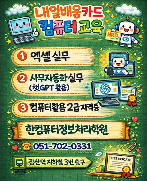 #한컴퓨터정보처리학원, #컴퓨터교육, #내일배움통합교육, #내일배움카드교육, #내일배움교육, #국비교육, #국비지원컴퓨터학원, #고용노동부지원교육, #IT국비지원, #컴활자격증, #ITQ자격증, #엑셀교육, #파워포인트교육, #한글문서작성, #직업훈련, #해운대컴퓨터학원, #디지털역량교육, #AI활용교육, #사무자동화교육, #한컴교육, #실무중심교육, #실업자훈련, #재직자훈련, #컴퓨터학원추천, #국비지원교육기관, #해운대컴퓨터, #부산컴퓨터학원, #한컴정보 <img src="https://blogthumb.pstatic.net/MjAyNjAyMTlfMjQ0/MDAxNzcxNDU1OTYwMjA3.snHgiArGoCe7x9RPUNR-mVI5AaCIUiMu9tL4JH3lyxUg.TAgDIDshpTMLUn3R_C9B67_jPs-x43OVoiwjk4PYE1sg.JPEG/IMG%A3%DF7702.JPG?type=s3" />