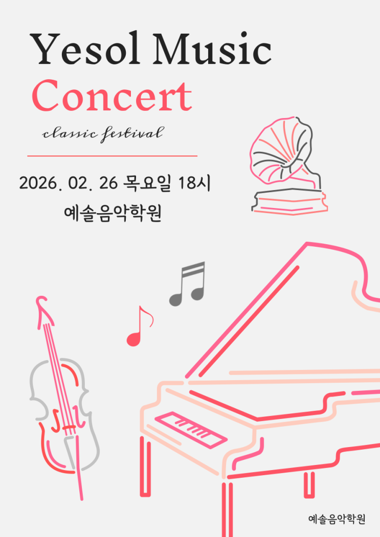 2월 26일 목요일 18시 예솔음악학원에서 정기연주회가 열렸습니다! 올해 오프닝은 특별하게 장구 연주로 시작해봤는데요〰️ 힘차게 울려 퍼진 장구 소리 덕분에 연주회의 문이 더욱 의미 있게 열렸네요! 피아노 무대에 오른 아이들은 장난칠 때와는 다른 모습으로 진지하게 연주해주었어요. 살짝 떨리는 손끝..!(부들부들) 그 느낌을 알기에 이 또한 소중한 모습이었어요 무대를 준비하며 연습했던 시간, 실수하고 다시 도전했던 순간들, 입 툭〰️튀어 나와서는 하기싫다고 외쳤지만 어느새 이제 잘된다며 쫒아오던 귀여운 예솔 아이들 그 모든 과정이 모여 오늘의 무대는 완성되었어요 늘 믿고 응원해주시는 학부모님들 덕분....... <img src="https://blogthumb.pstatic.net/MjAyNjAyMjdfMjEy/MDAxNzcyMTgyNzY4MDYy.Kv4LVEjh5X367j7ORWeR2ehAWLk9pBPthxRsT-C4tWMg.bhhTjv2dLzes0EpxiJQC7cUQlfbq-UvDtXYbT46qgJMg.PNG/%C1%A4%B1%E2%BF%AC%C1%D6%C8%B8%A3%AD%C6%F7%BD%BA%C5%CD%A3%AD001.png?type=s3" />