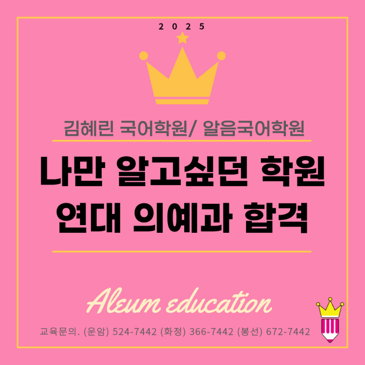 솔직하게 혼자만 알고 싶었던 학원입니다. 하지만, 누구보다 적극적으로 소개하고 있습니다. 제가 연세대 의대를 합격한 비밀은요... 요즘 알음교육은 매일 합격소식이 이어지고 있고, 특히 메디컬 합격이 압도적입니다. 오늘 전해드릴 소식은 연세대학교 의과대학 입결입니다. 서강고에 재학중인 오늘 합격의 주인공은 처음부터 특별했습니다. 조금 더 솔직하게 이야기 드리자면, 특별하게 불안했다고 해야 할까요? 전 과목 1.0을 받는 학생이었습니다. 국어를 빼고요.국어만 유독 2등급이 떴습니다. 수학도 1.0, 영어도 1.0, 탐구도 1.0. 모든 과목이 완벽한데 국어만 흔들렸습니다. 전교 상위권 학생에게 국어 2등급은 치명적이인 것 잘 아실....... <img src="https://blogthumb.pstatic.net/MjAyNTEyMjFfMjAy/MDAxNzY2MjgwODUxNjgw.cB5rsB7txV_7NYe0EHd95ifNtuDhUgd9KqfjY42ySuUg.Edr3lXoDnmp2tfBlCsf1Zikk8F6YvkUPiUrYKbtM_MQg.PNG/1.png?type=s3" />