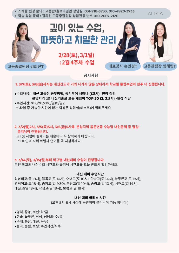 [올가국어 고등관] 3/7(토),3/8(일) 올가국어 고등관 수업안내