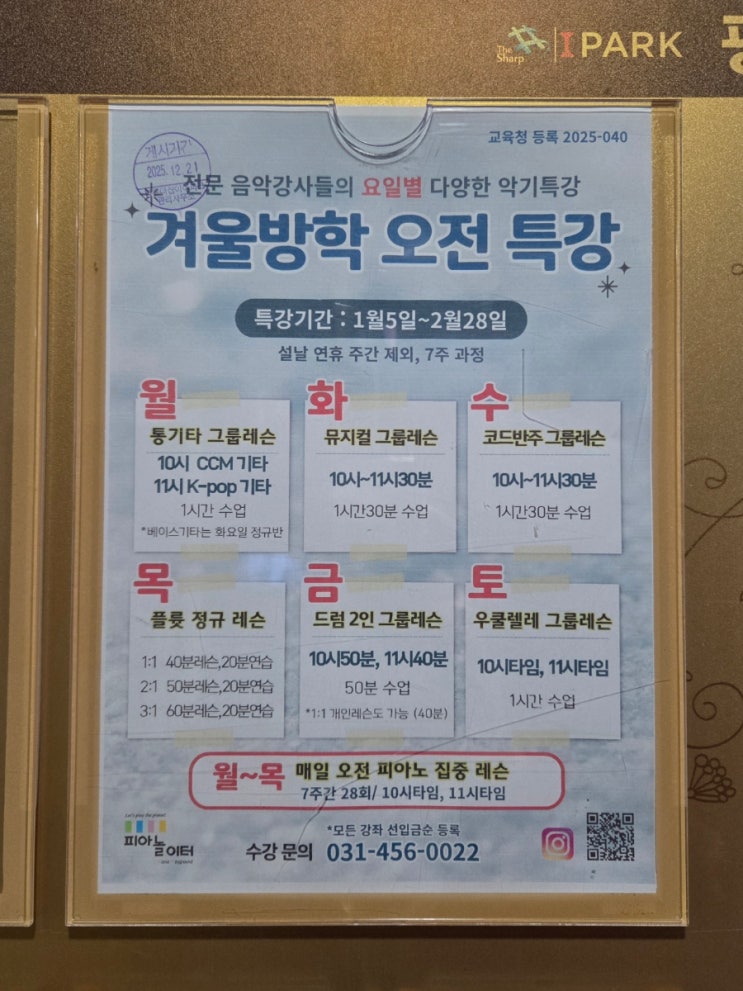 2025년 2학기가 마무리되면.. 새학기를 준비할 겨울방학이 다가옵니다~ 겨울방학 2달동안.. 울 친구들의 오전시간을.. 의미있고 보람되고 즐겁게... 피아놀이터에서 음악을 경험하고 배우며.. 보내기를 추천합니다~ <매일 오전 피아노 집중 레슨> 월요일~목요일 매일 오전 10시 또는 11시에 피아노 집중레슨!! 방학중 오전시간을 활용하여.. 학기중에 부족했던 시간을 충족하면서.. 피아노 집중레슨으로 피아노실력 향상은 물론.. 감성, 인성도 성숙해 집니다~ (총28회 레슨, 타임당 1시간 수업) <월요일 통기타 그룹레슨> 10시 - CCM기타, 11시 - Kpop기타, 전문 기타강사님의 커리큘럼으로.. 기타의 입문과정부터 기본주법과....... <img src="https://blogthumb.pstatic.net/MjAyNTEyMTVfMjcw/MDAxNzY1NzM3ODY2MDM1.d3-4syRVzmKk9O8gVVFn1mbgelYBO2mjTw7vnI67XKgg.UAuEDAwnbwDj8EVTR3kFps3vCgfjBxIdW6mmaXjTczMg.JPEG/900%A3%DF20251208%A3%DF095055.jpg?type=s3" />