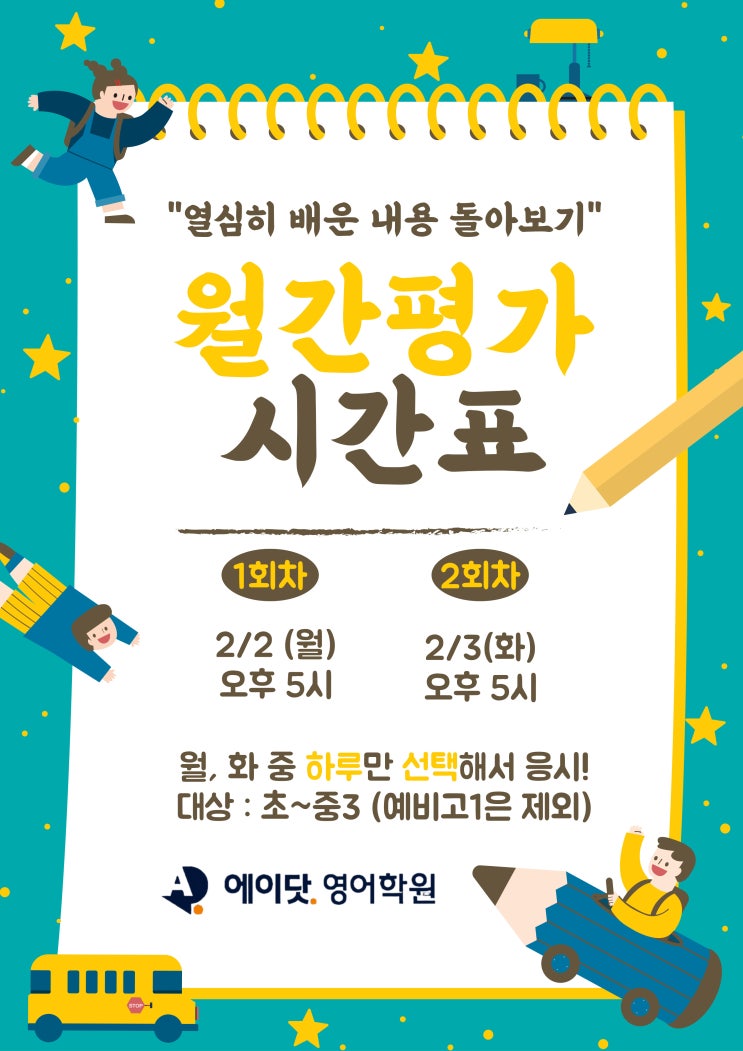 안녕하세요~ 파주운정 에이닷 영어학원입니다 :D 어느덧 한 달의 학습을 마무리하는 시기가 찾아왔어요! 매달 꾸준한 학습만큼 중요한 것이 바로 월간평가인데요. 월간평가는 한 달 동안 배운 내용을 얼마나 정확하게 이해했는지 점검하고, 앞으로의 학습 방향을 설정하는 아주 중요한 과정입니다. 에이닷 영어학원 월간평가란? ✔ 한 달간 학습한 핵심 개념 및 유형 점검 ✔ 학생 개인별 강점·약점 분석 ✔ 내신·수능 대비를 위한 맞춤 피드백 제공 단순히 시험을 보는 데서 끝나는 것이 아니라, 평가 결과를 바탕으로 학생 개개인에게 맞는 1:1 커리큘럼을 재설계해 다음 달 학습 효율을 더욱 높여줍니다. 특히 파주운정 에이닷 영어학원....... <img src="https://blogthumb.pstatic.net/MjAyNjAxMjFfMTE3/MDAxNzY4OTg3OTkxNTI2.-7sy41CjdO38B0Z23Ws5NKyOXaSSlXsEyRw_I1TtJWEg.lsEKF4X7J4jEB7s-Gb1TgQnirrYH_sXFDbPgyxqPPnQg.JPEG/%BF%F9%B8%BB%C6%F2%B0%A1.jpg?type=s3" />