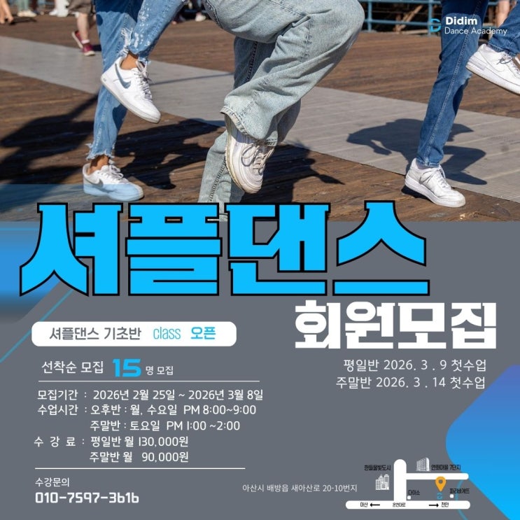 안녕하세요! 아산의 흥과 활력을 책임지는 디딤댄스학원입니다! 새해를 맞아 셔플댄스의 인기가 정말 뜨거운데요! 특히 직장인분들의 문의가 폭주하여, 성원에 힘입어 새로운 클래스를 오픈하게 되었습니다. [디딤댄스] 2월 셔플댄스 시간표 평일 기초저녁반 (신규개설) 월·수 | 저녁 8:00 ☀️ 주말 기초반 (신규개설!) 토요일 | 오후 1:00 ☕ 평일 기초오전반 (상시모집) 오전반: 월·수 | 오전 10:00 낮 반: 수·금 | 오후 1:00 저녁반 인기 폭발! [월/수 저녁 8시] 신규 모집 퇴근 후 나만의 시간을 갖고 싶은 직장인분들 주목! 기존 저녁반이 금방 마감되어 아쉬워하셨던 분들을 위해 월요일, 수요일 저녁 8시 클래....... <img src="https://blogthumb.pstatic.net/MjAyNjAyMjdfMjk2/MDAxNzcyMTk2OTI2NTU1.a2dnUzcsKMwrg-rGnNGWqTAbXwNCgt2uNN3V1bbyGCUg.eZj7V2U-Yc3_aHT817Hiw23fTcOFRz9lft8bN5E6hU4g.JPEG/%BC%C5%C7%C3%B4%ED%BD%BA_%C0%FC%B4%DC%C1%F6_2024%C0%C7_%BB%E7%BA%BB_%28%C0%CE%BD%BA%C5%B8%B1%D7%B7%A5_%B0%D4%BD%C3%B9%B0%29.jpg?type=s3" />