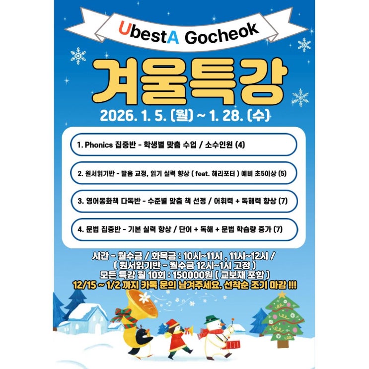 안녕하세요, 유베스타 고척어학원 입니다. 이번 2026년 겨울방학을 맞이하여 1월, 한 달 동안 오전 시간을 활용하여 겨울방학 특강이 개강되었어요 ! 모든 특강이 개강되었고, 정원을 모두 다 채우게 되었습니다 ! 원하는 1 ~ 2명 학생까지 포함하여 열정적인 특강을 기대하게 되었습니다 ㅎㅎ 1. Phonics 반 학생들 모두 알파벳과 소리값을 공부하여 자신있게 단어를 읽을 수 있게 되었습니다! 2. 원서읽기 반 ( feat.해리포터 ) 가장 인기가 많은 해리포터 원서읽기 반은 기존 멤버들과 함께 새로운 학생들 모두 지난 시즌과 다른 해리포터 책을 읽으며, 발음 + 읽기 능력 상승 + 내용 파악(이해력) 등의 성취감과 함께 재미있는 추억을 만들어....... <img src="https://blogthumb.pstatic.net/MjAyNjAyMjJfMjE3/MDAxNzcxNzYxNjc2MjEx.5Bw96RGvPeQhp0QeV427-ypAQR3AKBPhETh_6GHq5Agg.N-xpi7AcjlG09_9az2X-exICqNbakWppAn_-J5_Vn5Yg.JPEG/KakaoTalk_20260106_081403.jpg?type=s3" />