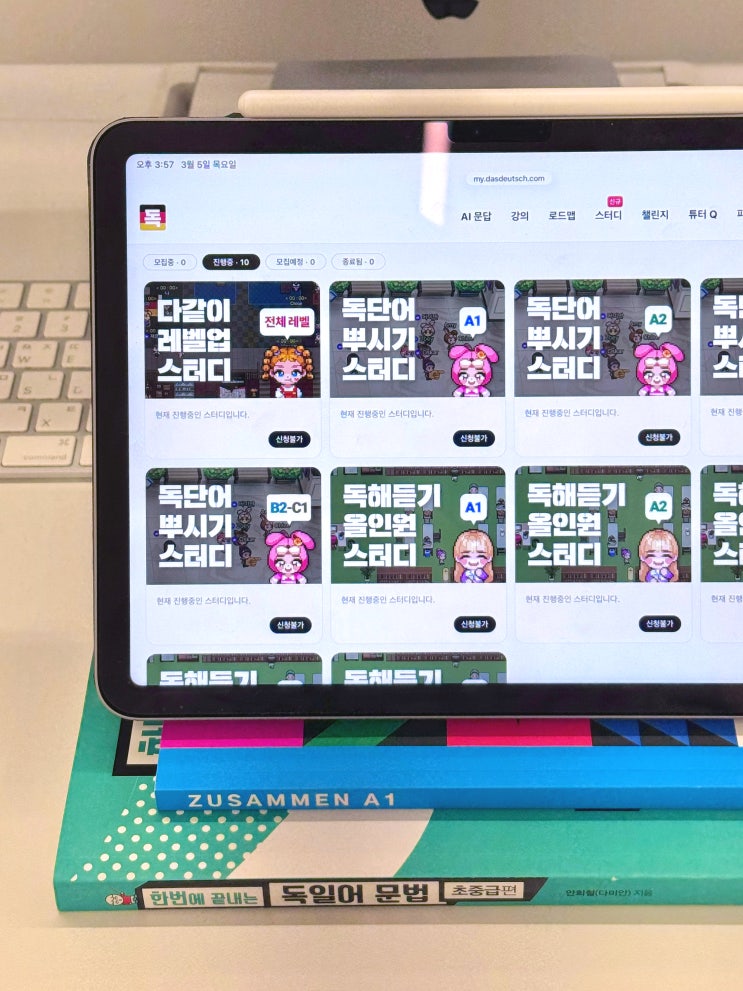 독독독 스터디를 찾아오시는 분들의 이야기를 들어보면 비슷한 패턴이 있어요. 앱도 깔아봤고, 유튜브도 봤고, 인강도 결제해봤는데 어느 순간 멈춰있다고요... 혼자 공부할 때 가장 무너지기 쉬운 게 바로 방향과 흐름이거든요. 무엇을 해야 할지 모르겠고, 쉬어도 뭐라 할 사람이 없으니까요. 독독독 스터디는 그 빈자리를 채우기 위해 만들어졌어요. 독독독 스터디가 왕초보를 위한 이유 독일어 공부를 막 시작하는 분들에게 가장 필요한 건 멈추지 않을 수 있는 환경이에요. 아무리 좋은 콘텐츠도 혼자라면 3일을 못 넘기는 경우가 많거든요. 독독독은 20일이라는 집중 기간 안에 매일 해야 할 것을 명확히 제시하고, 같은 목표를 가진 멤버....... <img src="https://blogthumb.pstatic.net/MjAyNjAzMDVfNTUg/MDAxNzcyNjk3MjQwOTE1.8PVZH9Xrn4TL6m-LH86umsMmBS1YBNrAtGFi-X8qNr0g.K7i4l3mZ__LKIFXiPq0DhKjdaw8d2Li7g9oU9yuoKh8g.JPEG/IMG_3452.JPG?type=s3" />