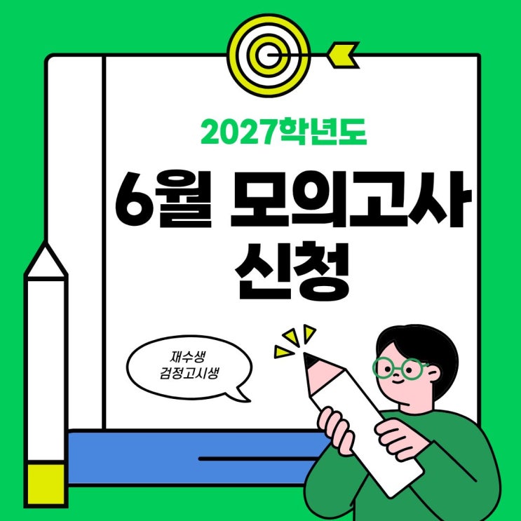 안녕하세요 한양학원 충무로 점입니다. 오늘은 2027학년도 6월 모의고사 접수 기간 / 학원 / 방법을 알아보겠습니다. 2027학년도 6월 모의고사 2026년 6월 4일 목요일 시행 오전 8시 40분부터 오후 5시 45분까지입니다. 시행계획 공고는 3월 중에 예정입니다. 6월 모의고사 접수 대상 대상은 고3 재학생, N 수생 (재수생 검정고시생) 이와 동등한 자격이 있는 접수기간은 해당 연도 4월 중순에서 5월 초입니다. 정확하게 일정이 공지되면 확인 후 접수가 가능한 학원에서 진행을 하면 됩니다. * 해당 기간 교육청 사이트 또는 공고문 참고해서 접수 가능 6월 모의고사 접수 학원 1) 재학생은 소속 고등학교에서 자동 접수 2) 졸업생 검정고시생 재....... <img src="https://blogthumb.pstatic.net/MjAyNjAzMTRfMjcw/MDAxNzczNDgxODQwNDc2.62UN8_LQse415wKjXS4NW3xMAggVW651ukAeAqHPe3Yg.6X3_LGvIAMsz0FDNNJgPmzugBfUj6A6d724MxNfnKbgg.JPEG/%C1%A6%B8%F1%C0%BB_%C0%D4%B7%C2%C7%D8%C1%D6%BC%BC%BF%E4._%2869%29.jpg?type=s3" />