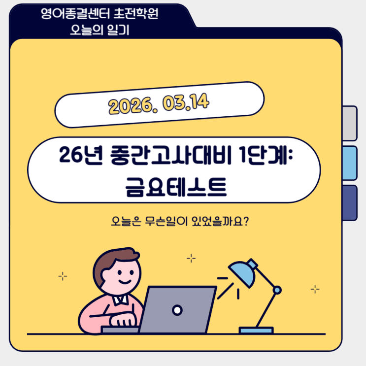 금요일이다. 초전동영어학원, 영어종결센터 초전학원의 언제나 가장 바쁜날. 평소와는 달리 중간고사 대비로 우선 학생들의 실력을 평가해보기로 했다. 그래서 훈련중심이 아니라, 실력평가중심의 문제를 출제했다. 동명중, 진명여중은 서술형이 많고, 어법영작이 비중이 크다. 그래서 기본으로 주제, 제목, 요지, 순서문제를 만들고, 어법 영작문제를 넣었다. 우선 영작문제는 단어배열로 만들었다. 처음부터 너무 난이도를 높이고 싶지는 않았다. 시험이 끝나고 전체적인 평가는 단어는 잘 만들어져있었다. 그동안 구두테스트를 매일 하던 덕분이다. 교과서 영작도 어느정도 되어있다. 단어배열문제는 대부분 잘 풀었다. 어법은 아직 모르겠다....... <img src="https://blogthumb.pstatic.net/MjAyNjAzMTRfMjcy/MDAxNzczNDM4ODg4OTA4.QtB8HkgO3juJCFkv1O_e1KPkuuSv-oaqLWS9TuxD70Ug.WClxE46KgY9UzZn59EzMhNP1nWXPUR2DGhMwZ555_rgg.PNG/%C1%A6%B8%F1%C0%BB_%C0%D4%B7%C2%C7%D8%C1%D6%BC%BC%BF%E4_-001_%2819%29.png?type=s3" />