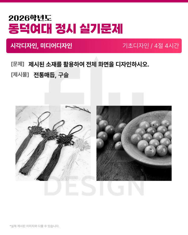 2026학년도 동덕여자대학교 미대 정시 기출문제 인천 플라이 미술학원 안녕하세요! 인천 플라이미술학원의 루다쌤이에요! 오늘은 2026학년도 동덕여자대학교 미대 정시 기출문제를 살펴볼거예요! 2026년 정시에 출제된 문제들과 올해 경쟁률까지! 함께 알아보도록 해요~ 그럼 지금부터 시작합니다! 2026학년도 동덕여대 정시 실기문제 시각디자인, 미디어디자인 [문제] 제시된 소재를 활용하여 전체 화면을 디자인하시오. [제시물] 전통매듭, 구슬 2026학년도 동덕여대 정시 실기문제 패션디자인, 실내디자인 [문제] 제시된 소재를 활용하여 전체 화면을 디자인하시오. [제시물] 고글, 스키스틱 2026학년도 동덕여대 정시 실기문제 디지털 공예 [....... <img src="https://blogthumb.pstatic.net/MjAyNjAxMzFfMjY2/MDAxNzY5ODMwNDA0NjQ1.zIDvenRyYaX1iHefaysSDKA_EwS9_Om8lrp_CGChYmwg.mlHr5tKuMinCujGu0-TzyKCcUZQkgEiplFvrKk595BIg.PNG/1.png?type=s3" />