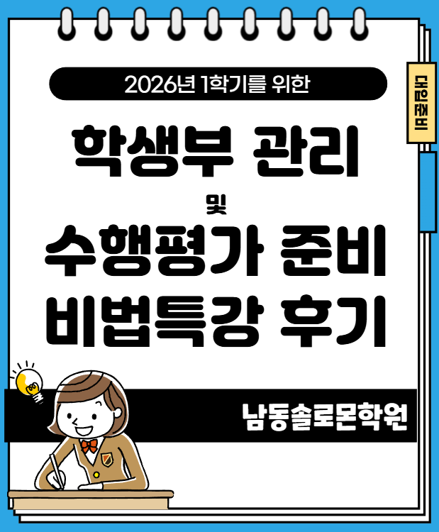논현동 고등학원 남동솔로몬학원에서 2026년 1월 30일 10시부터 5시까지 고등 입시 관련 학생부 관리 방법과 내신을 위한 고등 수행평가 준비 방법에 대한 특강을 진행하였습니다. 특별히 대치동에서 유명한 대한민국 최고의 입시 전문가인 이순천 소장님을 모시고 특강을 진행하였습니다. 예비 고1부터 고3까지 2026년 1학기 내신관리 비법에 대해 특강을 들을 수 있었던 시간이었습니다. 이른 아침이었지만 많은 학원생들이 자리를 다 차지하고 특강을 경청하였습니다. 특강은 1부와 2부로 진행되었고 첫 번째 특강은 학교 내신의 40% 이상을 차지하는 수행평가를 준비하는 방법에 대해서 특강을 진행해 주셨습니다. 일반적인 고등학교 내신은....... <img src="https://blogthumb.pstatic.net/MjAyNjAyMDZfMjkg/MDAxNzcwMzczNTI0ODAw.0Yos1jgF0cWXa3GaUy6LJe7kttdbrQ6jnidTnZVhNBIg._85N1K5shaR3i9mTjEiwkgn4WmdCgmwOmxwMTlP2sXcg.PNG/%BC%F6%B4%C9_%B4%EB%B9%AE.png?type=s3" />