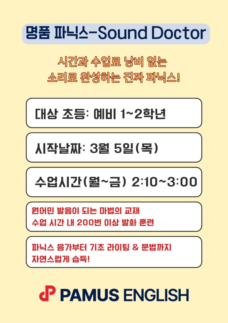 앞으로 변화되는 입시에서 영어는 언어로 시작해야 합니다. 영어를 수학공식처럼 문법과 독해 위주로 공부해서는 절대 좋은 성적을 낼 수는 없습니다. 영어를 모국어로 사용하는 미국·영국 아이들은 파닉스를 단기간에 끝내지 않고, 보통 3년 이상 장기적으로 반복 학습하며 소리 체계를 몸에 익힙니다. 파닉스의 핵심은 ‘눈으로 단어를 외워 읽기’가 아니라 ‘소리(음가)로 읽어내는 힘’을 기르는 것입니다. 그래서 장모음이 들어간 tape를 ‘타페’라고 읽는 것이 아니라 트 / 에이 / 프 → 테이프처럼 소리를 하나씩 연결해 자연스럽게 읽어낼 수 있어야 하며, 음가에서 나오는 발음 역시 원어민처럼 정확하게 나올 수 있어야 합니다. 파머....... <img src="https://blogthumb.pstatic.net/MjAyNjAyMDlfMTA5/MDAxNzcwNjM5MzE2MDY4.i--TxAyZUEvqBpEPvG09FJO0zXv9ls2P5U8f0Dhp_Dwg.o3vYs7kfo3yGCbvPa5YApXkFjAWNzHSRnMUjwRTdZ3Ag.JPEG/1.jpg?type=s3" />