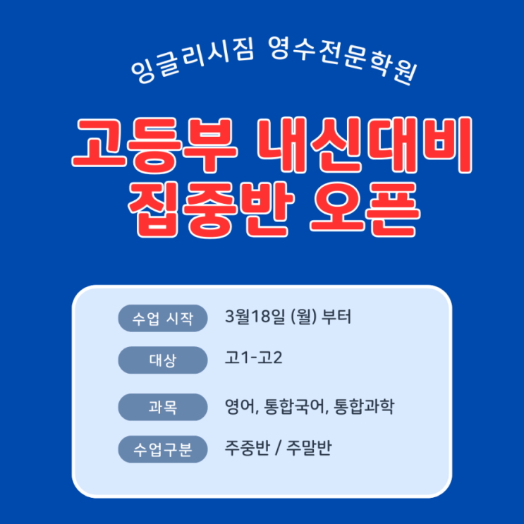 중간고사 대비를 위한 골든타임을 사수하라! "고등 영어, 암기가 아니라 '전략'입니다. 변형 지문까지 예측하는 잉글리시짐의 데이터 내신." "내신 1등급을 결정짓는 서술형, 감점 요인을 잡아내는 1:1 밀착 첨삭 시스템." "우리 학교 영어 선생님의 출제 습관까지 분석해 결과로 증명하는 내신 완성판." "모의고사 지문 30개, 언제 다 외울래? 키워드만 뽑아주는 '지문 구조화'로 공부 시간 반으로 줄여줄게." "옆자리 친구는 이미 시작 중간고사 대비, '나중에 해야지? 이미 늦습니다." 고등 첫 중간고사~ 철저히 준비해서 영어 자존감을 세워야죠. 주말을 저희에....... <img src="https://blogthumb.pstatic.net/MjAyNjAzMTZfMjA5/MDAxNzczNjU2MTUyNTg0.lZLz708xnhyEZMY_5Zy5jEzFjptN8Vm3bCBHKdFDPD0g.km_twZL3ISZOFd399hTJpVBwVi-5eW8ZOP3GLzXYacEg.PNG/900%A3%DF1.png?type=s3" />