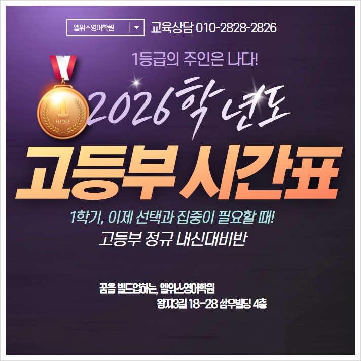 2026년 1학기 고등부 정규 내신대비 과정 안내 안녕하세요, 꿈을 빌드업하는 엘위스영어입니다. 첫 시험부터 1등급을 위해서는 고등학교 영어 내신은 중학교와 다른 방식으로 준비해야 합니다. 엘위스영어는 학교별 철저한 분석과 개별 맞춤 관리 시스템을 통해, 학생들이 시행착오 없이 첫 시험부터 결과를 만들어낼 수 있도록 진심과 최선으로 지도하고 있습니다. 아래는 2026년 1학기 고등부 정규 내신대비 과정 안내입니다. ■ 2026년 1학기 고등부 정규과정 운영 안내 1. 수업 운영 방식 엘위스 고등부 정규과정은 **주 45분 × 9타임 (총 6시간 45분)**으로 진행되는 개별 시간 선택제 수업입니다. 학생별 학교 시험 진도와 학습 수준에 맞....... <img src="https://blogthumb.pstatic.net/MjAyNjAyMjdfNTcg/MDAxNzcyMTYyNzE2MTEx.A82GzjJm2sc_026LdnawPrvEamG4a0vTa9-OKKPZ8Mog.v3s0vp2DM2egv5lztkbI2KMSOkghRnLypmlSMdEuelcg.PNG/image.png?type=s3" />