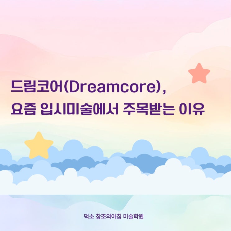 안녕하세요 :)) 덕소 창조의 아침 미술학원입니다. 수업 중 한 학생이 " 쌤! 드림코어 아세요? " 하고 물어보더라구요. 드림코어는 현실과 꿈의 경계가 흐려진 듯한 이미지, 낯설지만 익숙한 분위기. 최근 sns,시각문화에서 강하게 떠오르는 키워드가 바로 드림코어입니다. . . . . . . . . 드림코어는 꿈속 장면처럼 비현실적이고 불안하면서도 동화적인 감성을 담은 시각 스타일입니다. 어릴 적 기억, 익숙한 공간의 왜곡, 설명하기 어려운 감정이 이미지로 표현되는 것이 특징입니다. 입시미술에서 드림코어는 단순한 ‘예쁜 그림’이 아니라 학생의 내면과 사고방식을 보여줄 수 있는 강력한 주제가 됩니다. 왜곡된 공간, 비현실적....... <img src="https://blogthumb.pstatic.net/MjAyNjAyMjVfMTQg/MDAxNzcyMDE4MTEyNjAx.NU4SIQIzO0lDm5VftOUQ4We5YcOTHUDKckvGoYartaog.4AiU2hsfTmOkr5Z0W_cdIDuo207o6DYVgDbfoTyx-1Ug.JPEG/002.jpg?type=s3" />