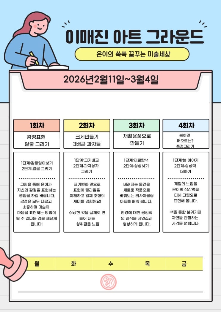 현재 이매진 아트 그라운드에는 43명의 아이들이 함께하고 있습니다. 하지만 우리는 단 한 명도 같은 방식으로 가르치지 않습니다. 왜일까요? 왜 아이마다 커리큘럼이 다를까요? 아이들은 모두 다르기 때문입니다. 어떤 아이는 말보다 손이 먼저 움직입니다. 어떤 아이는 그리기 전에 한참을 관찰합니다. 어떤 아이는 “틀릴까 봐” 시작을 어려워합니다. 겉으로 보기엔 같은 6세, 같은 초등 1학년이지만 아이들의 감정 속도, 사고 방식, 표현 방식은 모두 다릅니다. 그런데 모두에게 같은 커리큘럼을 적용한다면 어떻게 될까요? ✔ 빠른 아이는 지루해지고 ✔ 느린 아이는 위축되고 ✔ 예민한 아이는 상처받습니다. 그래서 우리는 다르게 합니다....... <img src="https://blogthumb.pstatic.net/MjAyNjAyMTFfMTQ0/MDAxNzcwNzkwOTc2MDQz.Z43aeT9NBd2EPqiVz_NXhU5MiKDsUmp6gi9mWET0ZDcg.vmahvfFHB36w-6wITuPX8DXvTaoHJWEKVHTuiqohfIsg.JPEG/IMG%A3%DF2132.JPG?type=s3" />