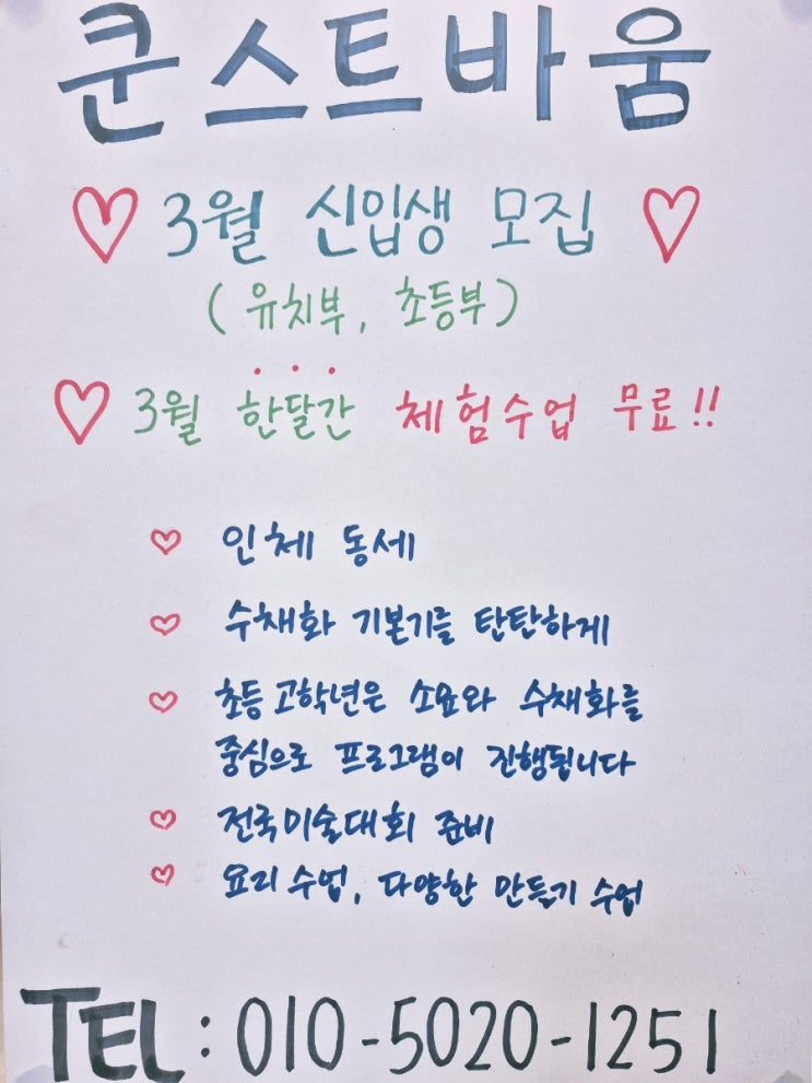 반갑습니다. 유아동 미술교육 전문학원 미술미술입니다^^ 쾌적한 환경과 시작이 다른 미술교육 경험을 자신하며, 미술전공은 물론 아동학 석사 출신 원장의 풍부한 경험을 바탕으로 유아, 초등, 중등부 등을 대상으로 퀄리티 있는 수업이 진행되고 있답니다 한 방향으로 치우치지 않는 조화를 이루는 힘이 있는 커리큘럼으로써 미술다운 미술교육을 추구하고 있으며, 미술의 중심과 기본인 드로잉(그리기)을 바탕으로, 창의적인 다양한 컨텐츠와 사실적인 표현력을 함께 키워주는 커리큘럼을 제공하고 있습니다. 또한, 개인의 미술적 성향에 맞춰 원생의 컨디션을 고려하여 수정 진행하고 있으며, 세계적인 미술교육 트렌드도 선별 적용하여....... <img src="https://phinf.pstatic.net/image.nmv/blog_2026_02_24_839/AzwKGhkJIu_03.jpg?type=f480x480" />