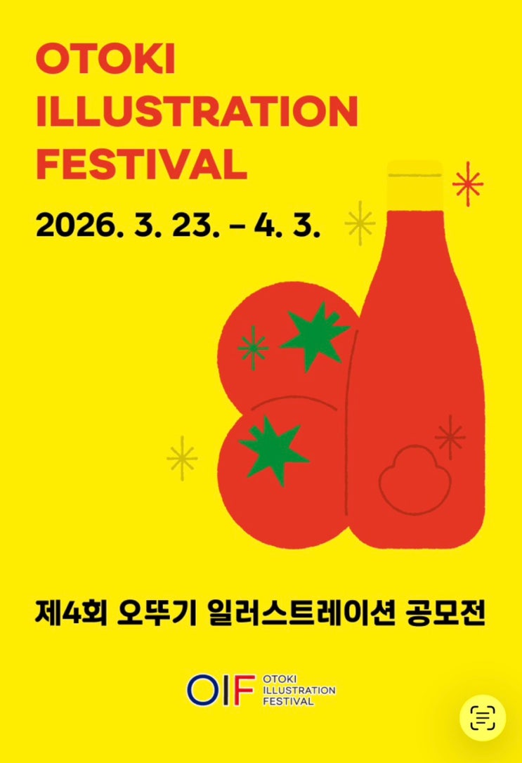 제4회 오뚜기 일러스트레이션 공모전 일정 • 접수기간: 2026.03.23 ~ 04.03 (오후 5시 마감)  • 1차 결과 발표: 4월 17일  • 최종 발표: 5월 8일  • 전시 및 시상: 5월 예정  ⸻ 참가 대상 • 어린이 / 청소년 / 성인 모두 가능 (초등학생부터 일반인까지 참여 가능)  ⸻ 공모 주제 (둘 중 하나 선택) 1. 오뚜기 케챂 → 55주년 기념, 자유롭게 표현 2. YELLOW → ‘노란색’을 주제로 오뚜기 제품 표현  ⸻ ️ 작품 내용 • 오뚜기 제품을 활용한 일러스트 • 회화, 디지털 등 다양한 방식 가능  ⸻ 시상 (총상금 약 3300만원) • 대상: 500만원 • 최우수상: 각 200만원 • 우수상: 각 100....... <img src="https://blogthumb.pstatic.net/MjAyNjAzMjFfMjUg/MDAxNzc0MDgzOTQyNjQ2.IhyH-iV1c1ufRCiMdX9DS094K0HJFFgu4k3QXbI76lsg.7aoWimPBgm0o_hwu3d3ByBY2pzyMgLFFZ_BSF8fiy-kg.JPEG/IMG%A3%DF7974.jpg?type=s3" />