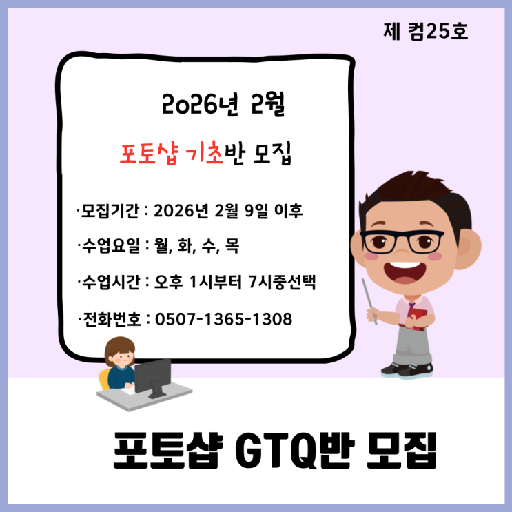 김해 포토샵 컴퓨터학원인 경남컴퓨터학원에서는 한국생산성본부에서 주관하는 GTQ 포토샵 시험 기준에 맞춰 2026년 2월 8일부터 GTQ 포토샵 자격증을 준비하시는 분들을 대상으로 수업을 운영할 예정입니다. 2026년 2월 GTQ포토샵반 GTQ포토샵 수업은 2026년 2월 9일 이후부터 시작 가능하며, 월요일부터 목요일까지 운영됩니다. 수업 시간은 오후 1시부터 7시 사이 중에서 개인 일정에 맞는 시간을 선택해 진행할 수 있습니다. 2026년 2월 GTQ포토샵 자격증반 수업 방식 GTQ포토샵 수업은 단체 방식이 아닌 개인별 진행 방식으로 운영되며, 각자의 진도에 맞춰 시험 준비를 이어갈 수 있도록 구성되어 있습니다. 2026년 2월 GTQ포토샵 자격증 수....... <img src="https://blogthumb.pstatic.net/MjAyNjAyMDZfNTMg/MDAxNzcwMzU3MTQ5NTAz.mvedZT6dtDhOO83J5aMV_v6hXwr6GATLT8XqqUlVAJwg.S2a2tiu6mJNzeVcilsN7d2-xWmr-9yZNA40BUIDa1V4g.PNG/%B1%E8%C7%D8%C6%F7%C5%E4%BC%A5_%C4%C4%C7%BB%C5%CD%C7%D0%BF%F8_2026%B3%E2_2%BF%F9_%BC%F6%BE%F7%BF%EE%BF%B5.png?type=s3" />