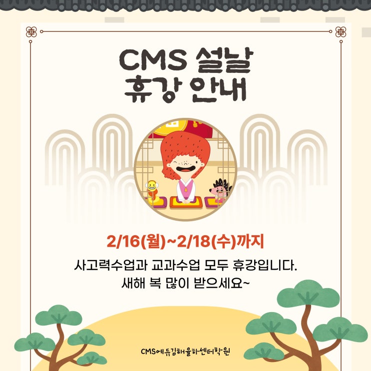 안녕하세요 CMS김해율하영재교육센터입니다 2/16(월)~2/18(수) 설날 휴강일로 모든 수업이 휴강입니다. 새해 복 많이 받으세요~ CMS에듀김해율하센터학원 l 학원등록번호 : 제 3741호 <img src="https://blogthumb.pstatic.net/MjAyNjAyMDdfMjM0/MDAxNzcwNDM2MDg3NDk3.9odUwjKB7m_zAswzQkcZJLCxZ8t712XEQVczj8bSETEg.7eiZUyq3OHMDouj4OGGXXK-TUsiaFv82hSd0O7h7yScg.JPEG/2026%BC%B3%B3%AF%C8%DE%B0%AD%BE%C8%B3%BB.jpg?type=s3" />