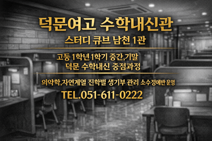 3월 신학기 입학 이후 4주간 덕문여고 1학년 수학 내신 중점 수업과 함께 의대,수의대,약대,자연계열 학과(주요대학별) 진학을 목표하는 고등 1학년들의 생기부 컨설팅 관리 프로그램이 남천 스터디 큐브 1관에서 동시에 운영을 합니다. 고등1학년들은 내신 5등급제 기준에서 의약학,인서울 주요대학별 수시 지원은 물론 정시 전형 지원에서 역시 학생부 서류 반영이 가장 큰 관건 입니다. 내신 등급이 좋은 학생들일지라도 교과 역량 외 비교과 역량의 수치를 파악하는데 있어 취약성이 드러나게 된다면 사실상 고등 3학년 이후 결과적 만족이 하락할수 있는 가능성이 높습니다. 이를 위해 덕문여고 수학 내신관을 운영하는 스터디 큐브 남천관....... <img src="https://blogthumb.pstatic.net/MjAyNjAyMTFfMTY1/MDAxNzcwNzk0MzkwMTU2.96tn6LT0xpfLFl6CeKo_9L9SjMzS9zos0j_q_dp8tygg.a49Q_u7ZK2lOQg4II9qHurDFh0noV41uPjUGVhW00akg.PNG/8ea767e1-05c8-4a74-97f7-c84c0f9c7fd6.png?type=s3" />