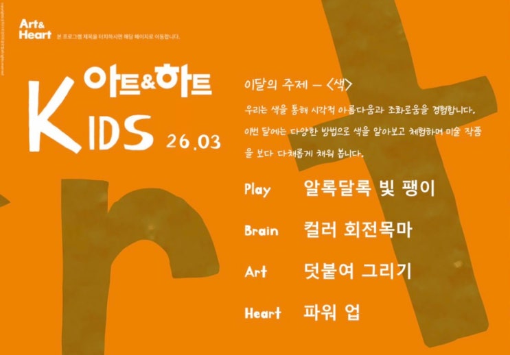 2026년 3월 키즈 프로그램 “색”으로 배우는 감정 · 사고 · 표현의 확장, 3월 키즈 수업의 주제는 ‘색’입니다. 색은 단순히 그림을 예쁘게 만드는 요소가 아닙니다. 색은 감정을 담는 언어이며, 사고를 확장시키는 매개체입니다. 아트앤하트의 3월 수업은 놀이·과학·인지·정서를 통합하여 아이들이 색을 경험하고 이해하고 표현하도록 설계된 프로그램입니다. ⸻ ① Play – 알록달록 빛 팽이 이번 활동에서는 아이들이 직접 팽이를 디자인하고 회전시키며 색이 섞여 보이는 현상을 관찰합니다. ✔ 서로 다른 색이 회전하며 하나로 보이는 경험 ✔ 빛의 반사와 혼합에 대한 직관적 이해 ✔ 속도에 따른 시각 변화 관찰 CD를 활용해 빛의....... <img src="https://blogthumb.pstatic.net/MjAyNjAyMjhfMjY4/MDAxNzcyMjYzMzQ3MTUz.S3i_FIK1dKbcePHP5AsNqLmSXC9NwNogQkTg8W-vbyIg.hfoh1Wu84KdU7AF33g1lppUpJT3t_KRiegzUCZIydQwg.JPEG/IMG%A3%DF8264.jpg?type=s3" />