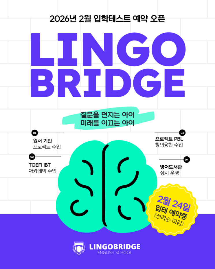 LingoBridge English School 2월 입학테스트 예약 안내 2026년 2월 신규생 모집 입학테스트는 2월 24일(화) 일괄적으로 진행됩니다. 링고브릿지 어학원 2026년 2월 신규생 모집 " 2/24(화) " 입학테스트 진행 ✔️ 입테 예약 : 1/27(화)-2/13(금) ※ 클래스별 선착순 마감 ✔️ 입학테스트 : 2/24(화) ✔️ 개강일 : 반별 상이 링고브릿지 어학원 2026년 2월 신규생 모집 올 해 상반기에는 신규반을 오픈하지 않으며 반 별 TO에 따른 ✔️ <추가 모집>만 진행합니다. 반 별 모집 인원이 많지 않아 조기에 마감될 수 있으니 신학기 등원을 희망하시는 분들은 ✔️ 꼭 미리 예약해 주세요! 입테 예약은 선착순으로 마감되며 테....... <img src="https://blogthumb.pstatic.net/MjAyNjAxMjZfMTMz/MDAxNzY5NDE1MDE4MDM5.Zv-p8C8fW9QstZa7t9sMEbOBw-70gESZ81FFlZT8GHog.5BxFPveiHb6CiBqQI8qJpodto1RuSuXLb1QfT52kYN0g.PNG/1.png?type=s3" />