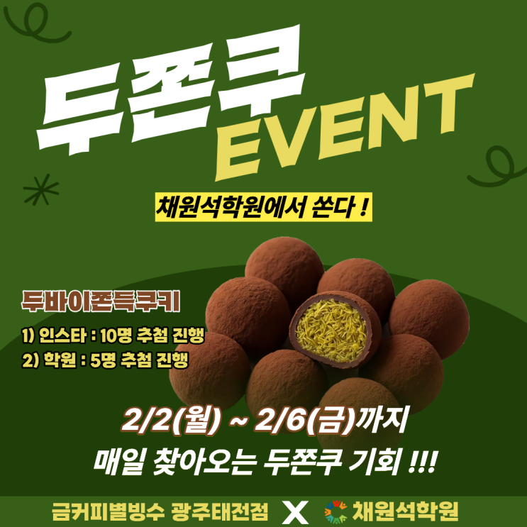 채원석학원 두쫀쿠 이벤트 안내 안녕하세요, 채원석학원입니다 재원생 여러분을 위한 달콤한 이벤트, 두쫀쿠 이벤트를 진행합니다! 채원석학원에서 재원생들을 위해 준비한 특별한 이벤트로, 2/2(월)부터 2/6(금)까지 매일 참여 및 추첨이 진행됩니다. [ 참여 방법 ] ① 인스타그램 진행 (총 10명 추첨) - 학원 인스타그램에 업로드된 두쫀쿠 이벤트 게시글에 본인 이름을 포함하여 자유롭게 댓글 작성 - 매일 추첨을 통해 총 10명에게 두쫀쿠 증정 (댓글 참여자 중 다음날 추첨 진행) * 이벤트 기간 동안 인스타그램 게시글은 매일 오후 12시 업로드 예정입니다. ② 학원 내부 진행 (총 5명 추첨) - 학원에 비치된 뽑기함에 [본인 이....... <img src="https://blogthumb.pstatic.net/MjAyNjAxMjdfNyAg/MDAxNzY5NDkzNTk5MjI2.j90u-QMTb04UDmqfmI6midzCCgaZUUf1nNUvRZ2nPPEg.lcalZxxjIXY2uhzy_ETQ07ikOOAM-PXSGFZZnawng98g.PNG/%C1%A6%B8%F1%C0%BB_%C0%D4%B7%C2%C7%D8%C1%D6%BC%BC%BF%E4..png?type=s3" />